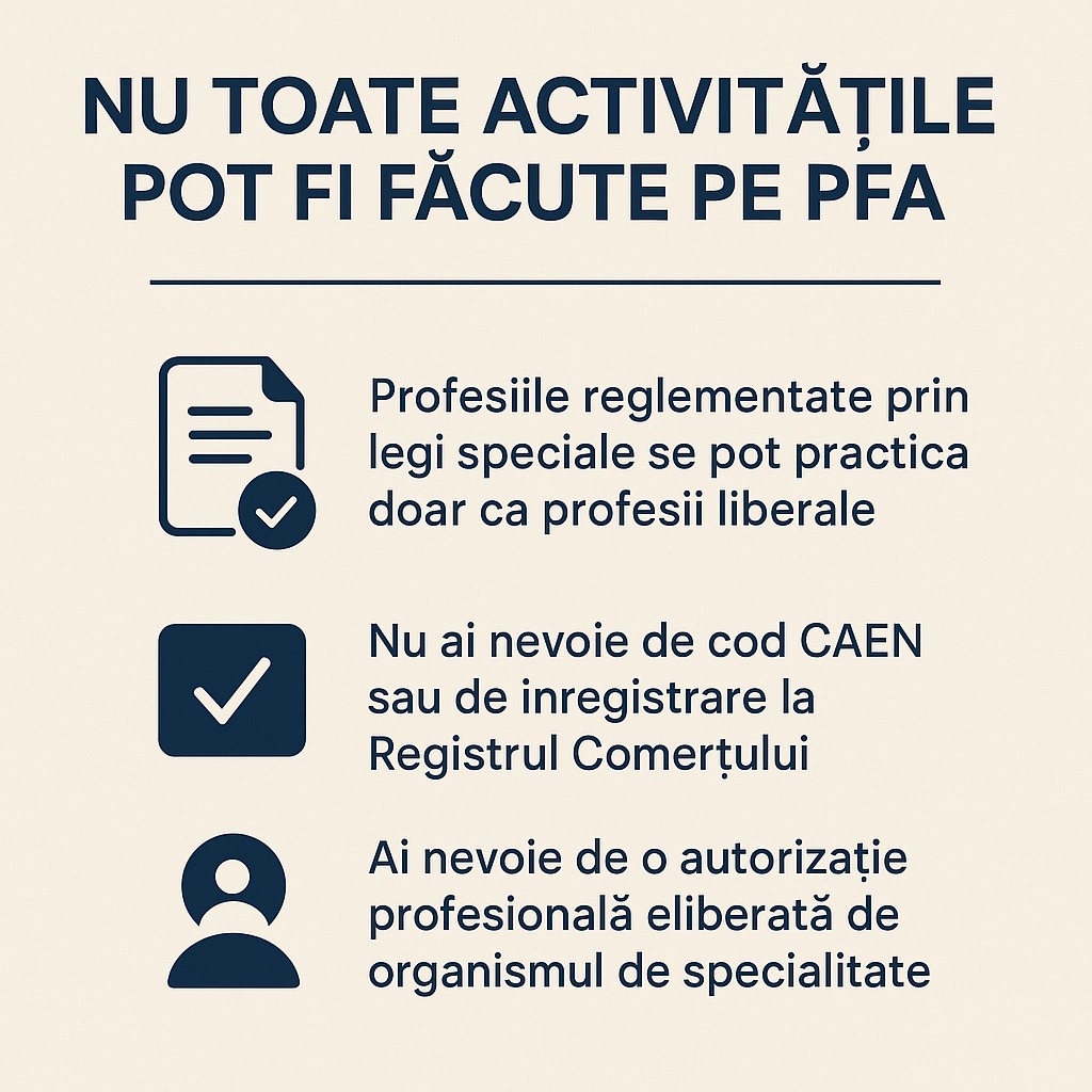 Dacă vrei să lucrezi independent, dar activitatea ta este reglementată printr-o lege specială, nu ai nevoie de PFA, ci de autorizație profesională eliberată de corpul de specialitate.